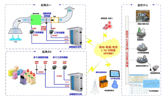 油煙監(jiān)測系統(tǒng)是為滿足環(huán)保行業(yè)特殊需求,利用物聯(lián)網(wǎng)感知技術(shù)、GPRS 無線通信技術(shù)等開發(fā)的一套高性能的集油煙監(jiān)測、數(shù)據(jù)采集、數(shù)據(jù)傳輸為一體的系統(tǒng)。可對企業(yè)油煙排放濃度、凈化器運(yùn)行狀態(tài)、風(fēng)機(jī)運(yùn)行狀態(tài)等指標(biāo)進(jìn)行在線監(jiān)控,從而將油煙治理設(shè)施工況數(shù)據(jù)與油煙濃度數(shù)據(jù)統(tǒng)一起來,為環(huán)保局提供直接有效且真實(shí)的油煙排放狀況的專用油煙監(jiān)測設(shè)備。