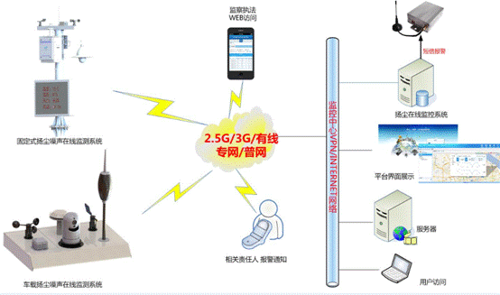 統(tǒng)由前端監(jiān)測設(shè)備、傳輸網(wǎng)絡(luò)和中心平臺三部分組成。前端監(jiān)測設(shè)備由車載式或固定式揚(yáng)塵噪聲監(jiān)測儀組成。