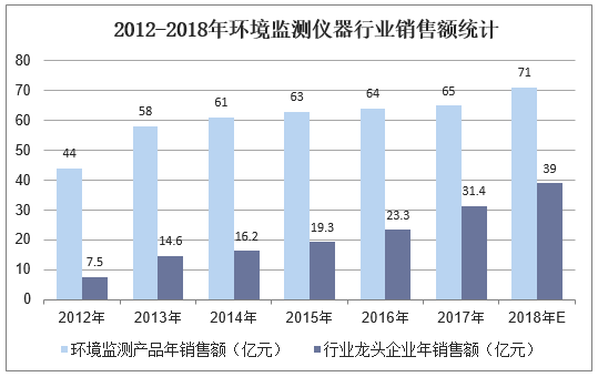 據(jù)統(tǒng)計(jì),2012-2017年中國環(huán)境監(jiān)測儀器行業(yè)銷售額穩(wěn)定增長,2017年銷售額為65億元,預(yù)計(jì)2018年銷售額為71億元。預(yù)計(jì)2018年龍頭企業(yè)銷售額在39億元左右。